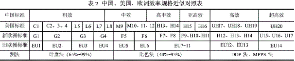 過濾效率是在特定測試方法下的測試值,在標記效率值時必須注明相應的測試方法,不同的國家有不同的表示方法,見表2。