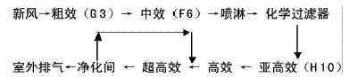 前工序作業(yè)室是l00級的凈化級別;前工序用力室和后工序的中測、組立、封入是l0000級凈化級別;選別和64M車間是l00000級的凈化級別。下面分別介紹一下不同級別凈化間的空氣凈化系統(tǒng)流程圖。