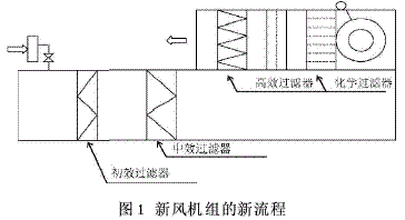 此外,為解決由于通過各個高效過濾器的風量不同而引起的個別循環(huán)空調(diào)機中的高效過濾器更換的頻度高的問題,可以在新風機中加裝化學過濾器和亞高效過濾器,將新風集中處理而不是將新風送到各循環(huán)風機中再進行處理,以減少由于各個循環(huán)風機風量的不同而增加的更換量。此問題已經(jīng)在我公司的新工程中得到了改善。在201#棟的新工程中新風空調(diào)機組采取的新流程如圖1所示。